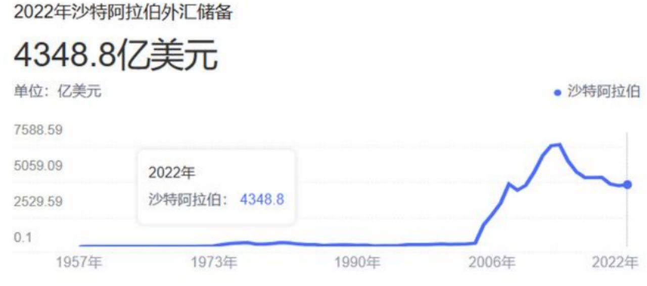 當(dāng)然我們不能單單只看GDP的經(jīng)濟(jì)測(cè)算,因?yàn)檫@只是在那一年這個(gè)國(guó)家國(guó)內(nèi)生產(chǎn)總值,而沙特只是外匯這一項(xiàng)就有著幾千億美元的儲(chǔ)備,比如說在2022年的時(shí)候,沙特就有著4348.8億美元的外匯儲(chǔ)備。